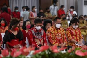 Selesai Kotbah dari Ketua Sinode GMIM, Wali Kota dan Wakil Wali Kota Manado didampingi istri masing-masing melantunkan lagu ‘Alangkah Bahagiannya.’