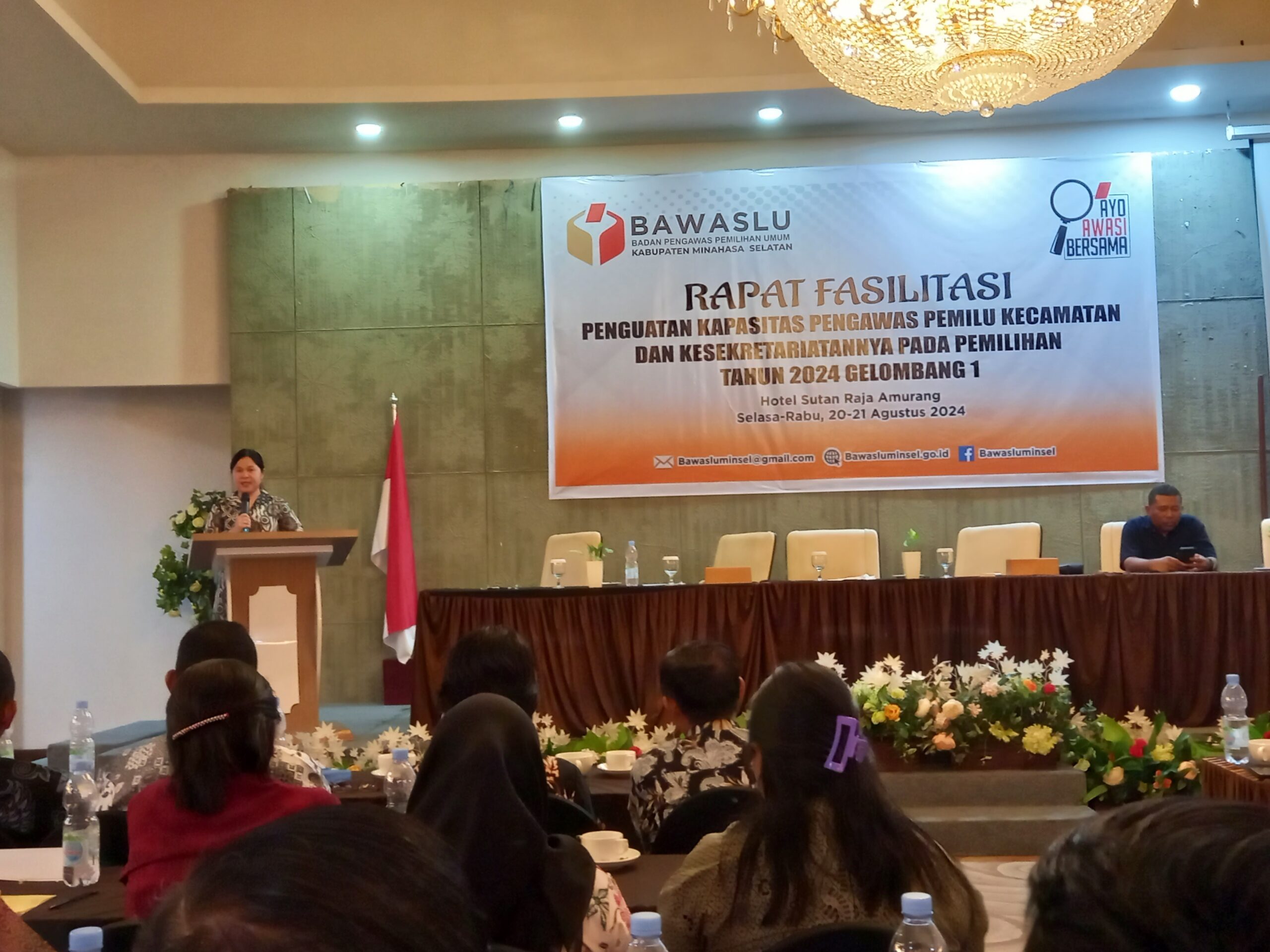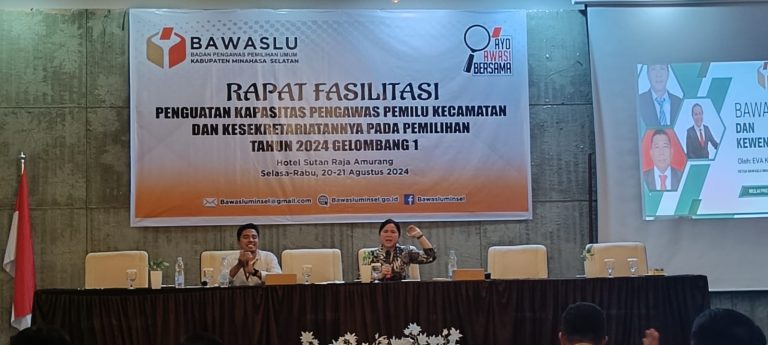 Minsel,teropongnusantara.com — Ketua Badan Pengawas Pemilihan Umum (Bawaslu) Kabupaten Minahasa Selatan (Minsel) Eva Keintjem membuka secara resmi rapat fasilitasi penguatan kapasitas pengawas pemilu kecamatan dan kesekretariatan pada pemilihan Tahun 2024 di Sutan Raja Hotel Amurang, Selasa (20/8/2024).