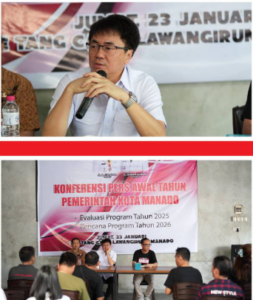 Manado,teropongnusantara.com — Wali Kota Manado Andrei Angouw, bersama Wakil Wali Kota Manado Richard Sualang, melaksanakan Konferensi Pers Awal Tahun Pemerintah Kota Manado dalam rangka Evaluasi Program Tahun 2025 serta Rencana Program Tahun 2026. Kegiatan ini berlangsung di The Tang Cafe Lawangirung dan dihadiri oleh Aliansi Pers Manado (APM). Jumat, (23/01/26).